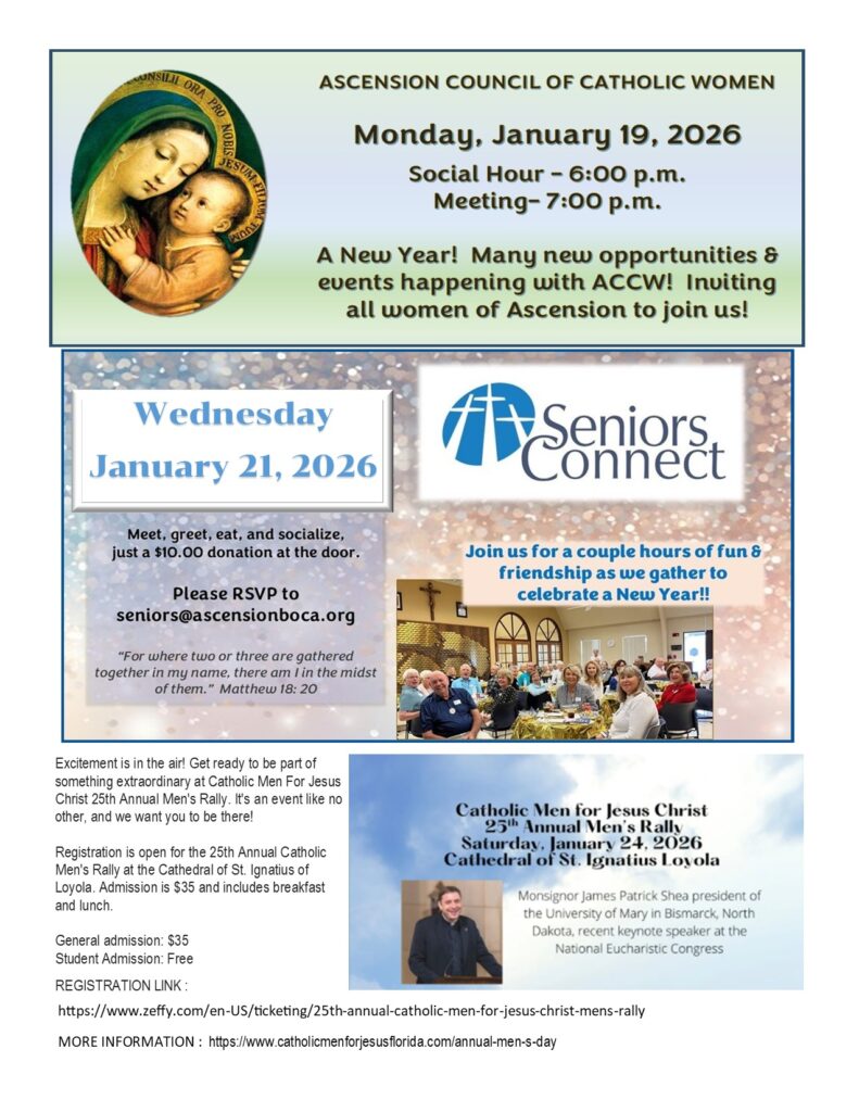 Have You Downloaded FORMED Yet? Our free gift to you! As our gift to you, we have purchased a subscription for one year! On FORMED you will find thousands of Catholic movies, books, bible studies, children’s progamming…perfect programming for the whole family! It is easy to sign up and you can watch on your phone, tablet, computer or tv. If you have any problems registering, please email communications@ascensionboca.org Go to formed.org/signup Enter 33487 or Ascension to select our parish Enter your name and email After you create your personal account, you can go to apps on your TV and search “FORMED” to watch on your big screen! Scan this qr code to watch videos on how to find content, how to download study guides, and so much more with the FORMED App. This is FREE for all Ascension parishioners! Exposition of the Blessed Sacrament – Mondays from 8:30 a.m. – Noon In mid-July, 1000’s of Catholics gathered Indianapolis for the 10th National Eucharistic Congress. (eucharisticcongress.org) This is the year of Parish Eucharistic Revival. In lieu of daily Mass, we are offering Exposition of the Blessed Sacrament every Monday from 8:30 a.m. – Noon. Come spend some time with Jesus, His Real Presence, in the Blessed Sacrament. Spend the morning or as much time as you wish with Him. You will find peace and rest. Rosary – 8:30 a.m. – 9:30 a.m. For our priests, for those in formation, for our country Silent Adoration – 9:30 a.m. – Noon PLEASE ENTER THE CHURCH AT THE SOUTH DOORS. ALL OTHER DOORS ARE LOCKED. Every Sunday at 10:00 a.m. Mass Children’s Liturgy is back! All kids, pre-school to 5th Grade are welcome to join us for a Gospel lesson created just for them. Our Helpers will be in the church to meet everyone before the readings and lead them to the Family Center where they will hear the Word of God through skits, crafts, songs, and much more! Kids will return to the church in time for Communion. Parents are welcome to join us, as well. Middle School and High School students who would like to volunteer to help with Children’s Liturgy should stop by the Info Booth in the Family Center after Mass to sign up and find out more. Our Information Booth, located in the Family Center is open after all weekend Masses. Register in the parish, schedule a Mass, and get your questions about our ministries and organizations answered while at church.