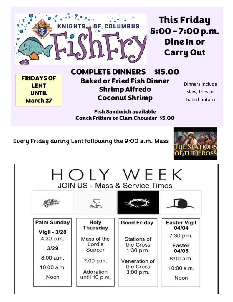 Scroll down for all the Events and Information! There is no charge for this special Lenten event! 2026 DIOCESAN SERVICES APPEAL Have You Downloaded FORMED Yet? Our free gift to you! As our gift to you, we have purchased a subscription for one year! On FORMED you will find thousands of Catholic movies, books, bible studies, children’s progamming…perfect programming for the whole family! It is easy to sign up and you can watch on your phone, tablet, computer or tv. If you have any problems registering, please email communications@ascensionboca.org Go to formed.org/signup Enter 33487 or Ascension to select our parish Enter your name and email After you create your personal account, you can go to apps on your TV and search “FORMED” to watch on your big screen! Scan this qr code to watch videos on how to find content, how to download study guides, and so much more with the FORMED App. This is FREE for all Ascension parishioners! Exposition of the Blessed Sacrament – Mondays from 8:30 a.m. – Noon In mid-July, 1000’s of Catholics gathered Indianapolis for the 10th National Eucharistic Congress. (eucharisticcongress.org) This is the year of Parish Eucharistic Revival. In lieu of daily Mass, we are offering Exposition of the Blessed Sacrament every Monday from 8:30 a.m. – Noon. Come spend some time with Jesus, His Real Presence, in the Blessed Sacrament. Spend the morning or as much time as you wish with Him. You will find peace and rest. Rosary – 8:30 a.m. – 9:30 a.m. For our priests, for those in formation, for our country Silent Adoration – 9:30 a.m. – Noon PLEASE ENTER THE CHURCH AT THE SOUTH DOORS. ALL OTHER DOORS ARE LOCKED. Every Sunday at 10:00 a.m. Mass Children’s Liturgy is back! All kids, pre-school to 5th Grade are welcome to join us for a Gospel lesson created just for them. Our Helpers will be in the church to meet everyone before the readings and lead them to the Family Center where they will hear the Word of God through skits, crafts, songs, and much more! Kids will return to the church in time for Communion. Parents are welcome to join us, as well. Middle School and High School students who would like to volunteer to help with Children’s Liturgy should stop by the Info Booth in the Family Center after Mass to sign up and find out more. Our Information Booth, located in the Family Center is open after all weekend Masses. Register in the parish, schedule a Mass, and get your questions about our ministries and organizations answered while at church.